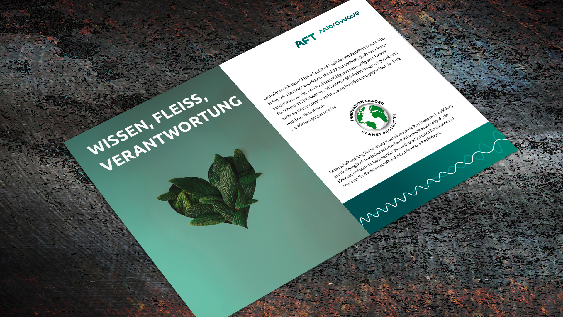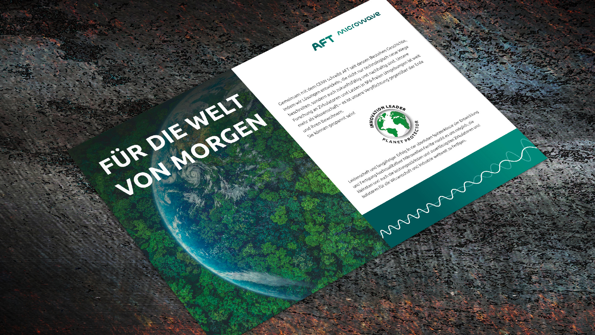 Grafik mit dem Titel "Innovate", die das Engagement von AFT für nachhaltige Technologien und die Vermeidung von SF6 zeigt. Im Hintergrund sind grüne Blätter abgebildet, während der Text die Mission des Unternehmens beschreibt, innovative Lösungen zum Schutz des Planeten zu entwickeln.